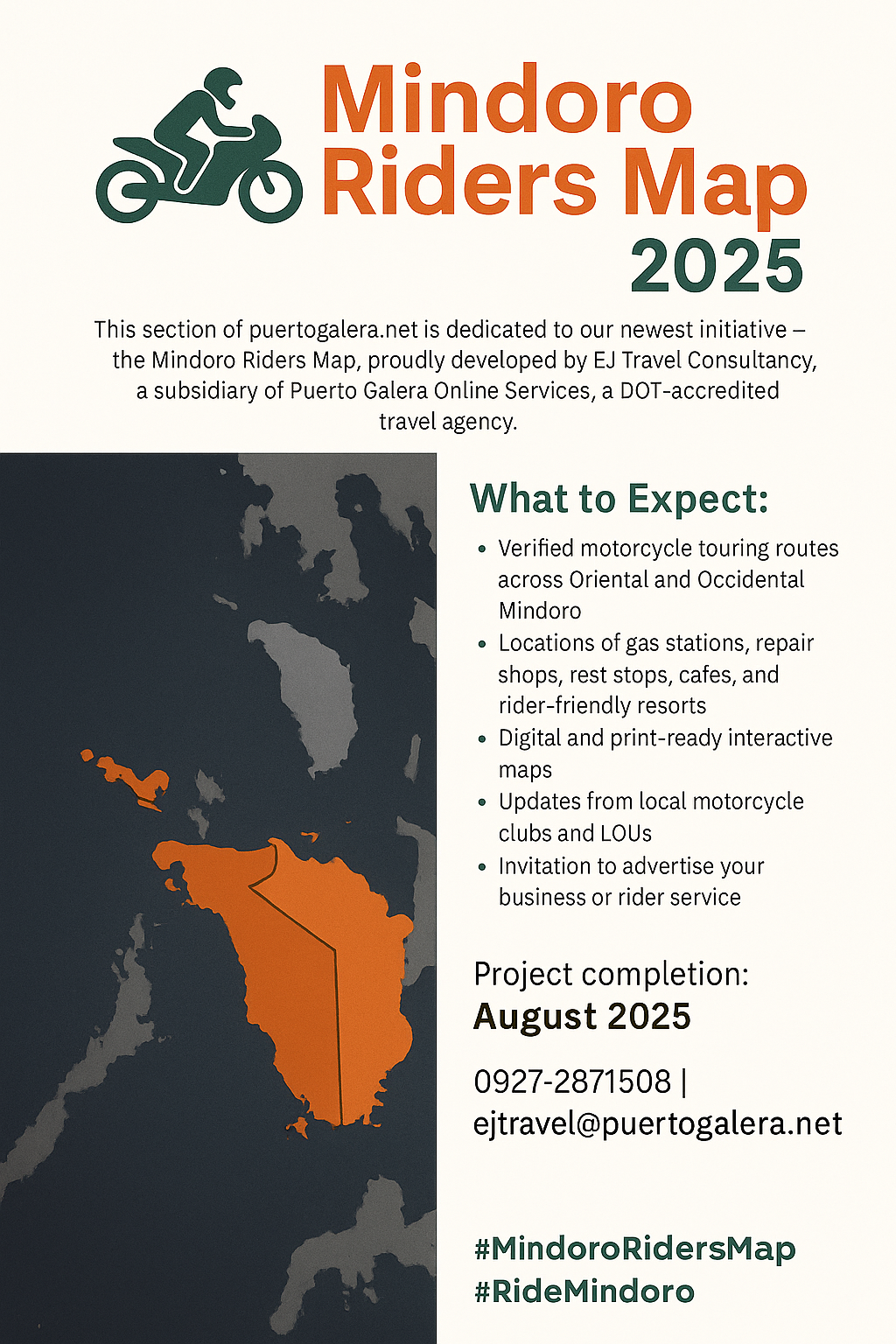 This section of puertogalera.net is dedicated to our newest initiative — the Mindoro Riders Map, proudly developed by EJ Travel Consultancy, a subsidiary of Puerto Galera Online Services, a DOT-accredited travel agency.